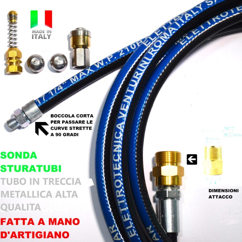 SONDA STURATUBI PROFESSIONALE,COSTRUITA A MANO D’ARTIGIANO MADE IN ITALY ED ANTIPIEGA, QUESTO PRODOTTO E REALMENTE DI FASCIA PROFESSIONALE COMPATIBILE CON IDROPULITRICI COMET, ITM, PORTOTECNICA E ALTRE CON M22
