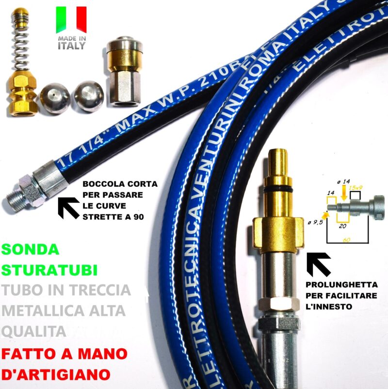 SONDA STURATUBI SPURGATUBI CON TUBO DI QUALITA ANTISTRAPPO E ANTIPIEGA IN TRECCIA METALLICA, RESISTE FINO A 210 BAR(SCOPPIO A 840BAR) MADE IN ITALY OTTIMA QUALITA ANTIPIEGA  PER IDROPULITRICE LAVOR E FASA